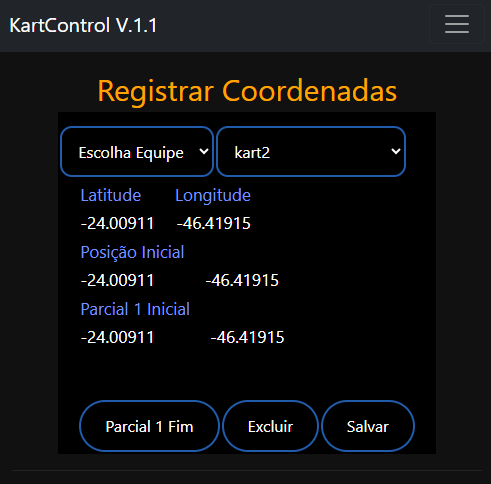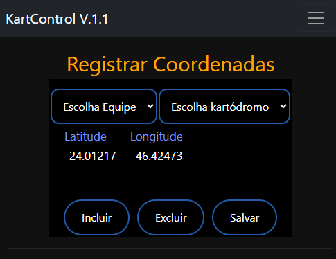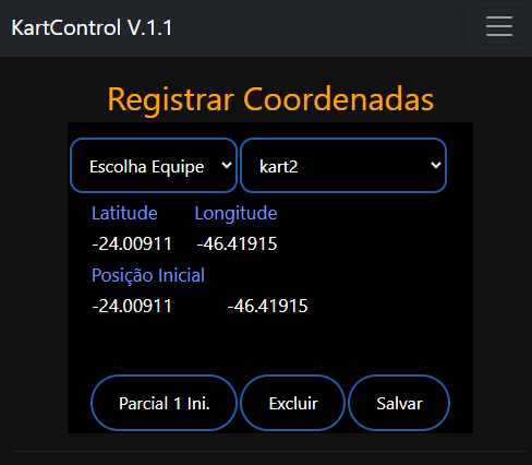 1. Vá até a tela Registrar Coordenadas e escolha um kartódromo ou uma equipe (caso tenha criado uma).